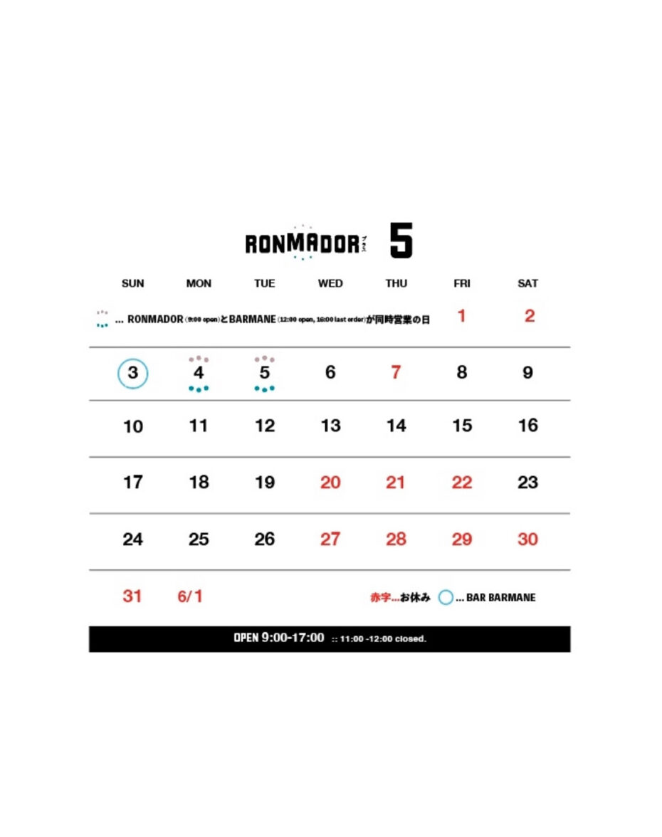 *RONMADORは9:00〜11:00/12:00〜17:00(11:00〜12:00クローズ)で、通常のメニューをご注文いただけます。BARMANEは12:00よりご来店お待ちしております。